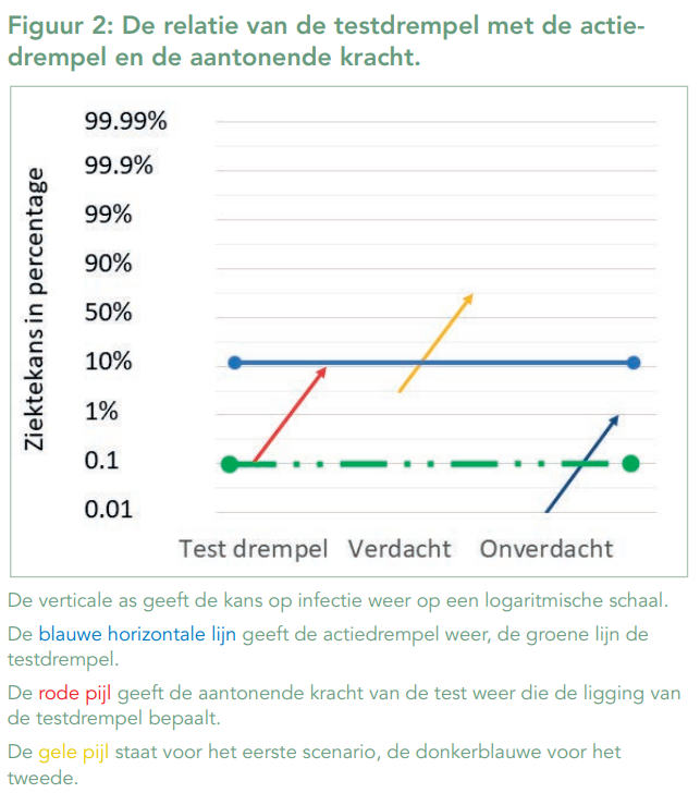 Een 70-jarige dame, alleenwonend in een serviceflat en tweemaal gevaccineerd is erg ongerust door wat ze op de televisie heeft gehoord, over stijgende besmettingscijfers en ziekenhuisopnames. Ze heeft geen klachten en heeft geen risicocontacten gehad, maar is wat paranoïde en vraagt een test. Stel dat de voorkans onder de 1 op 1000 zou liggen, dan zou ze onder de testdrempel liggen (figuur 2, scenario ‘onverdacht’). Bij een positief testresultaat zouden wij bij deze dame eerder de test herhalen dan onmiddellijk de diagnose meedelen. Pas als deze laatste test ook positief is, zouden we voldoende zekerheid bereikt hebben. Als deze controletest negatief zou zijn, zouden we te maken gehad hebben met een zeldzame fout-positieve uitslag en haar veel onnodige ongerustheid en rompslomp kunnen besparen. Een vergelijkbare situatie doet zich wellicht ook voor tussen twee golven van de epidemie bij testen die worden uitgevoerd voorafgaand aan een opname in een woonzorgcentrum, een heelkundige ingreep, een concert of een reis, alle bij personen zonder symptomen of risicocontacten.